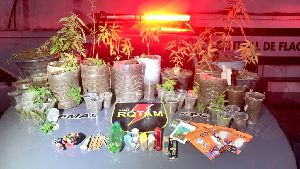 Durante a abordagem, ele confirmou que havia pés de maconha dentro da casa. Os militares realizaram buscas no interior do imóvel e encontraram, além das plantas, uma balança de precisão, sementes de cannabis, cigarros prontos para consumo, cachimbos, papéis de seda e filtros de acetato.