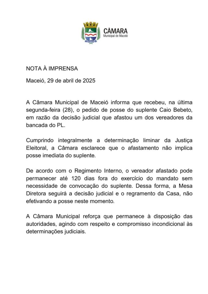A Câmara Municipal de Maceió informa que recebeu, na última segunda-feira (28), o pedido de posse do suplente Caio Bebeto, em razão da decisão judicial que afastou um dos vereadores da bancada do PL.
