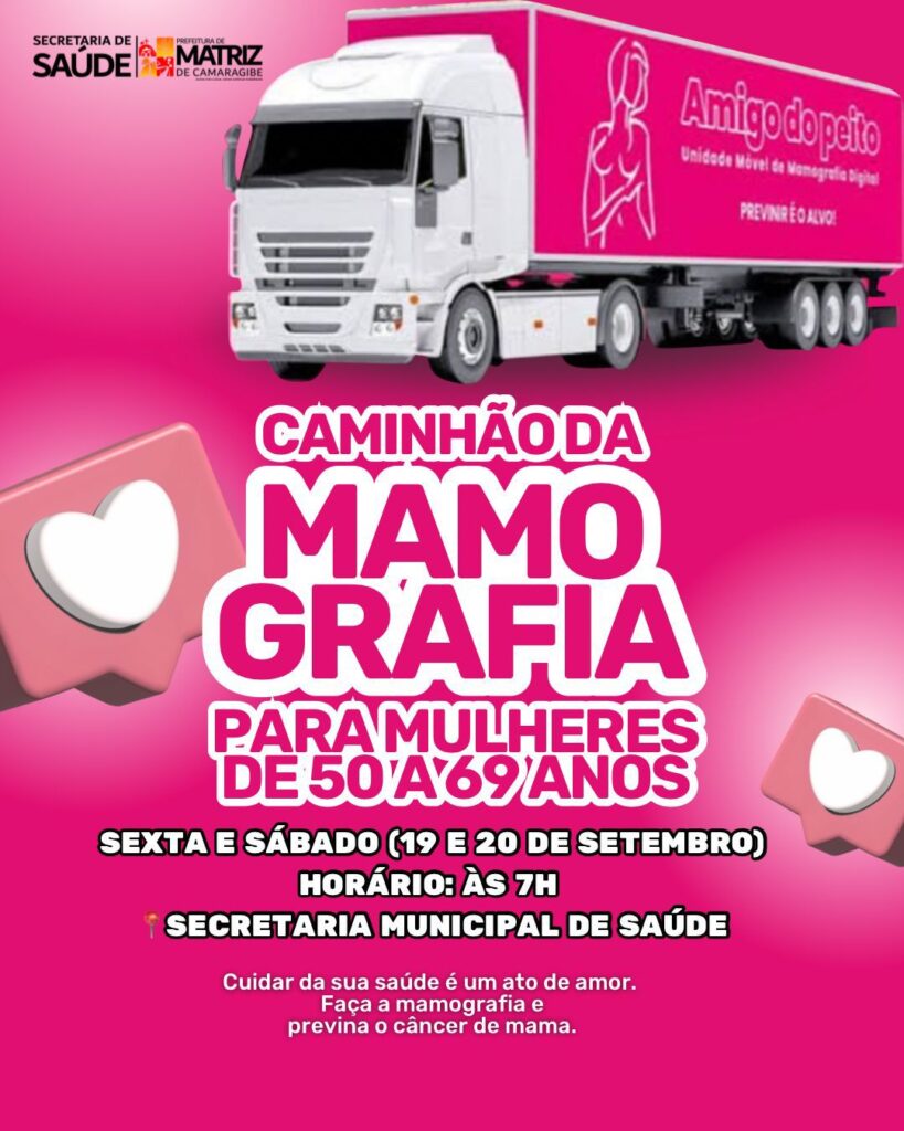 Na sexta e no sábado, dias 19 e 20 de setembro, o Caminhão da Mamografia vai estar em Matriz de Camaragibe, atendendo mulheres de 50 a 69 anos.