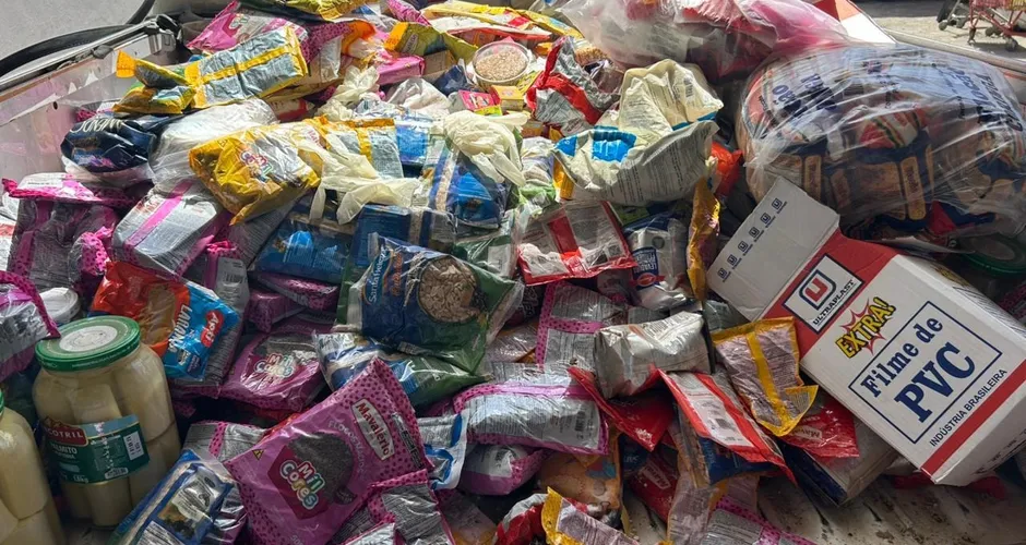 Entre os itens recolhidos estavam farinha de milho, fermento, chocolate, massa de bolo e outros produtos. A equipe identificou alimentos estragados e também mercadorias fora do prazo de validade, com vencimentos registrados em 2023, 2024 e 2025.