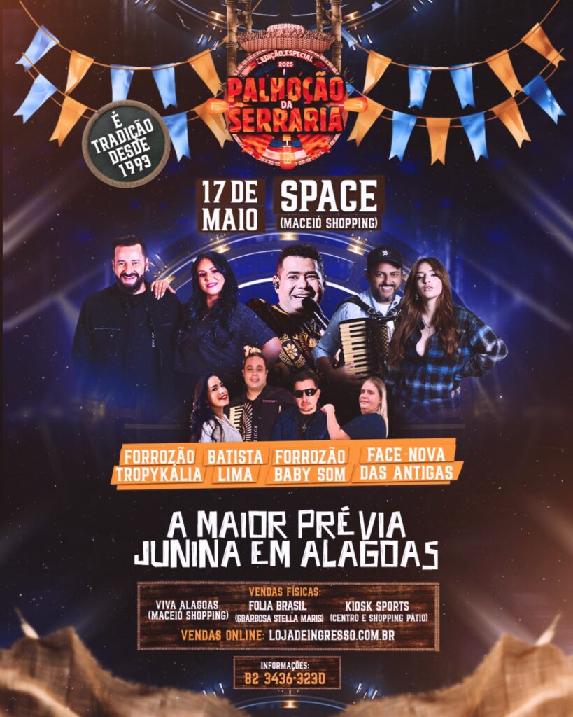 ”O tradicional “Palhoção da Serraria”, anuncia sua “Edição Especial”, para sábado (17) de maio, e desta vez o local escolhido para receber o evento foi o estacionamento do Maceió Shopping, que segundo a produção tem uma história muita parecida com a do evento.Atrações de forró nacional, como Forrozão Tropykália, Baby Som, Batista Lima e Face Nova das Antigas, banda de forró local, que fez história no palhoção.
