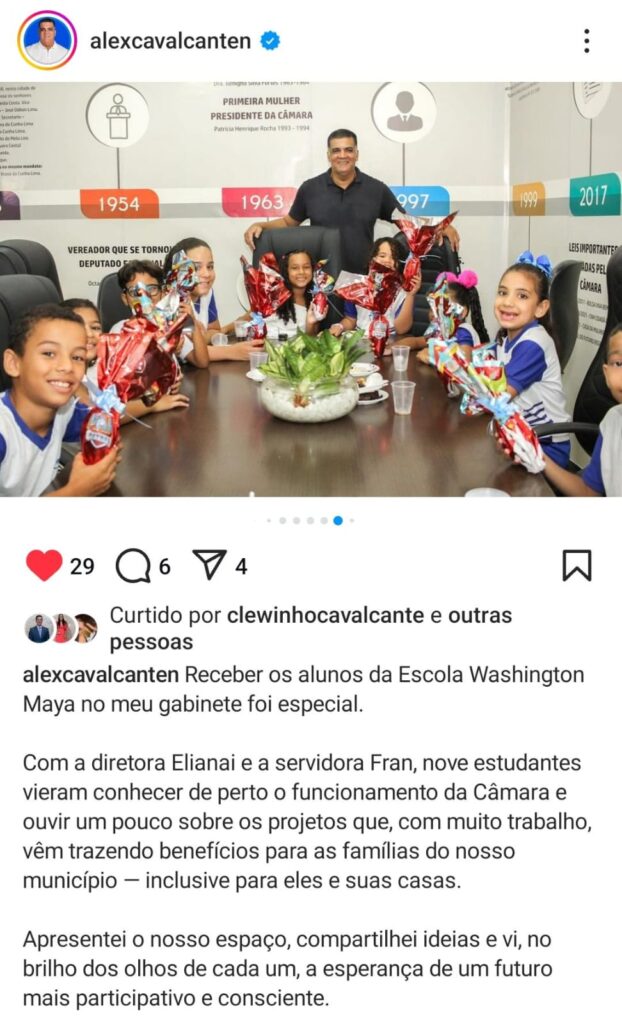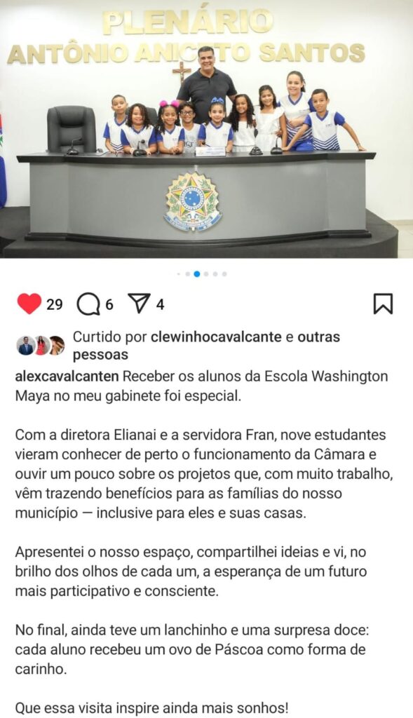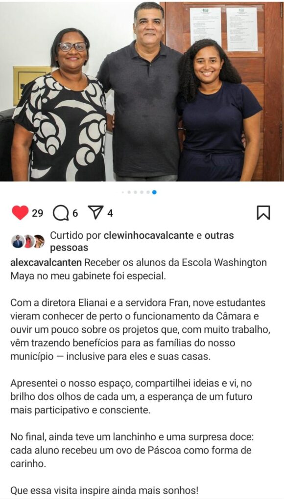 “Apresentei o nosso espaço, compartilhei ideias e vi no brilho dos olhos de cada um, a esperança de um futuro mais participativo e consciente “, disse o vereador Alex Cavalcante.