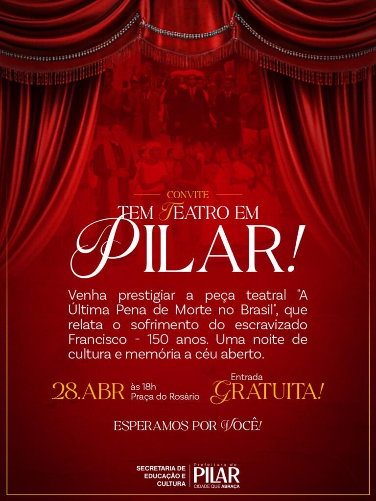 Pilar vivencia, nesta terça-feira (28), um momento de grande relevância histórica e cultural com a encenação do espetáculo “Última Pena de Morte – Francisco, o Escravizado”. A apresentação marca os 150 anos da última execução por enforcamento registrada no Brasil, ocorrida na cidade em 1876.