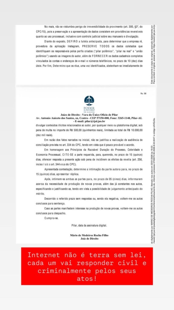 O Juízo de Direito da Vara do Único Ofício de Pilar acatou o pedido de tutela de urgência apresentado por Renato Rezende Rocha Filho. Segundo a denúncia, o ex-prefeito tem sido alvo de conteúdos falsos e tendenciosos publicados pelos perfis “pilar polêmico”, “pilar na real” e “união polêmico”.