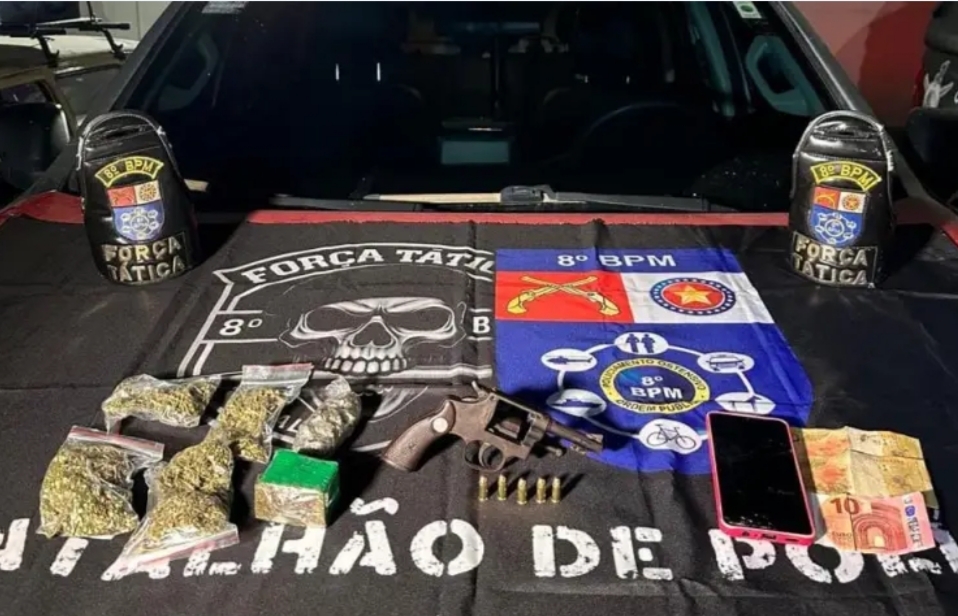Após uma varredura minuciosa no perímetro, os agentes localizaram uma sacola descartada contendo um revólver calibre .32 municiado, além de aproximadamente 150 gramas de cocaína e porções de maconha, parte já fracionada para venda e parte em estado bruto.