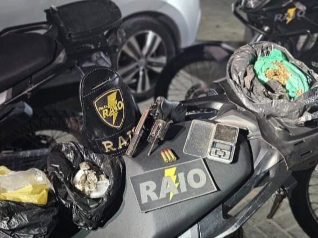 Na capital, a Companhia de Raio realizava motopatrulhamento tático no bairro do Jardim Petrópolis, quando recebeu uma denúncia de que um indivíduo estaria armado e traficando drogas na região. O suspeito, de 29 anos, ao perceber a presença policial, tentou fugir, descartando uma sacola e um objeto da cintura. Durante a perseguição, ele sofreu uma queda em área de mata, sendo imobilizado após resistir à abordagem.