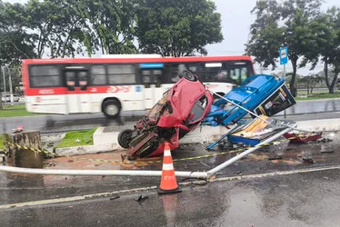 Apesar da força do impacto, o trânsito não foi comprometido, já que o carro permaneceu no canteiro lateral da via.